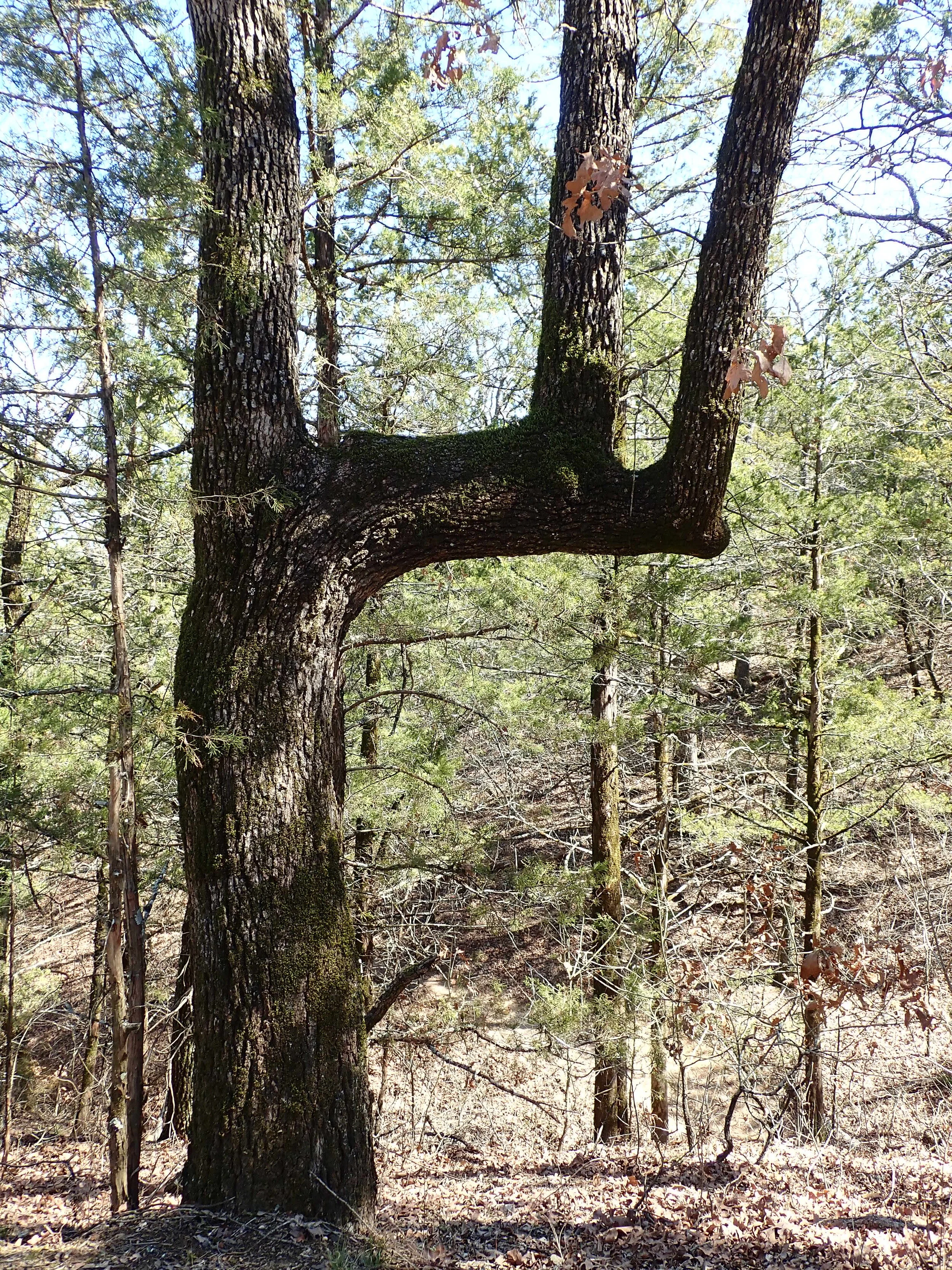 An unique sight.. maybe a “trail tree?” https://www.treehugger.com/trail-trees-living-native-american-legacy-4862242